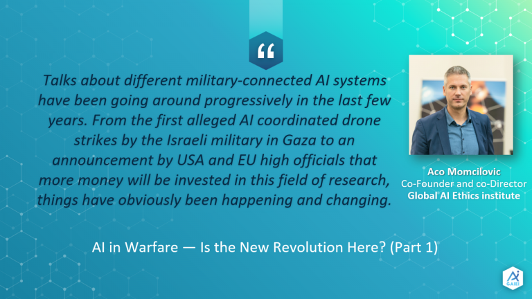 AI in Warfare — Is the New Revolution Here? (Part 1) June 2022 By Aco Momcilovic, co-Director of the Global AI Ethics Institute. Blog acomomcilovic.medium.com, June 2022. Read here