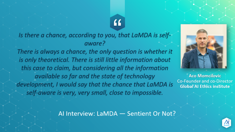 AI Interview: LaMDA — Sentient or Not? June 2022 By Aco Momcilovic, co-Director of the Global AI Ethics Institute. Blog acomomcilovic.medium.com, June 2022. Read here
